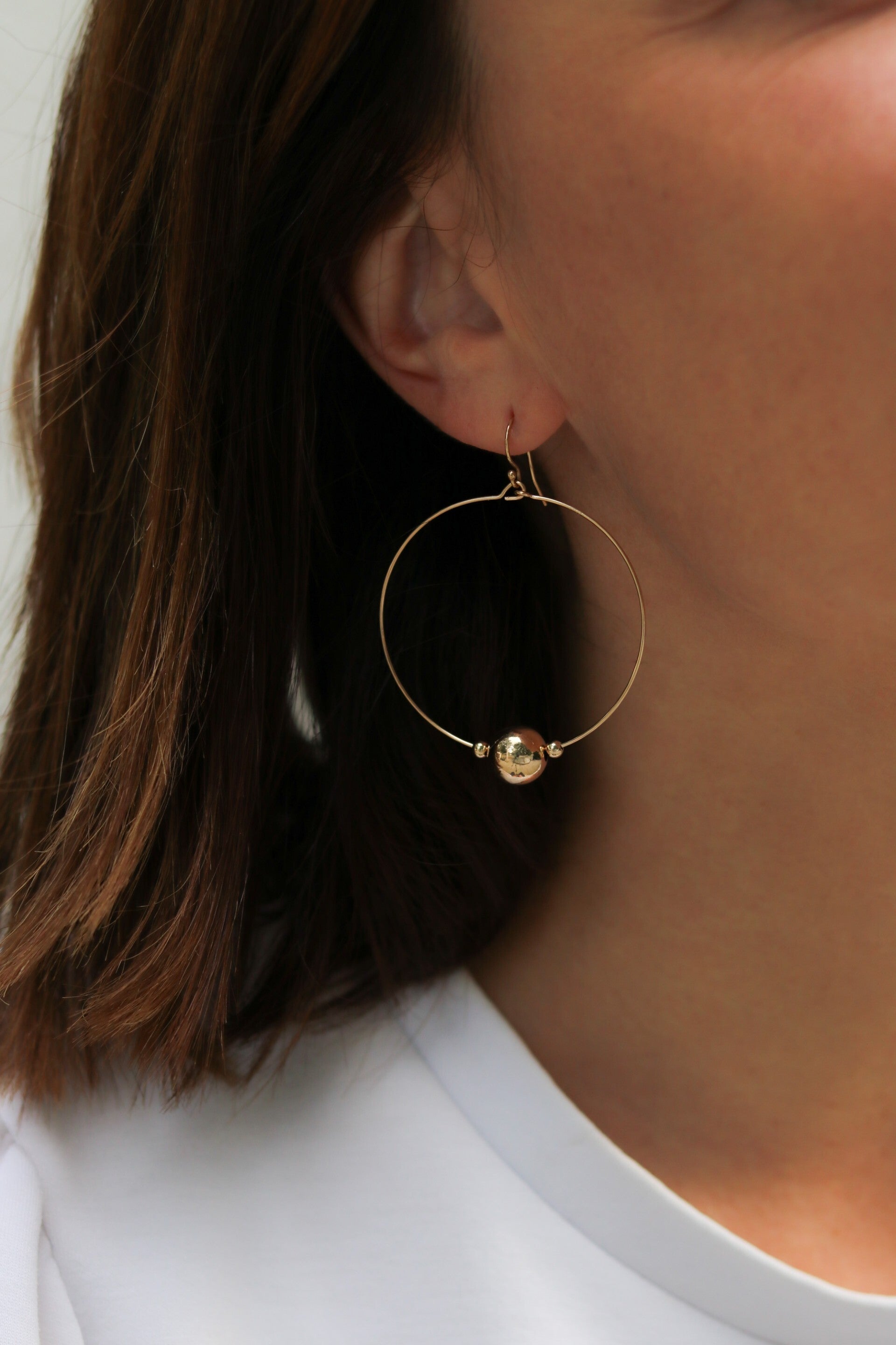 Deze oorbellen bestaan uit 14k gold filled creolen van 45 mm met grote 14k gold filled kraal van 10 mm.
