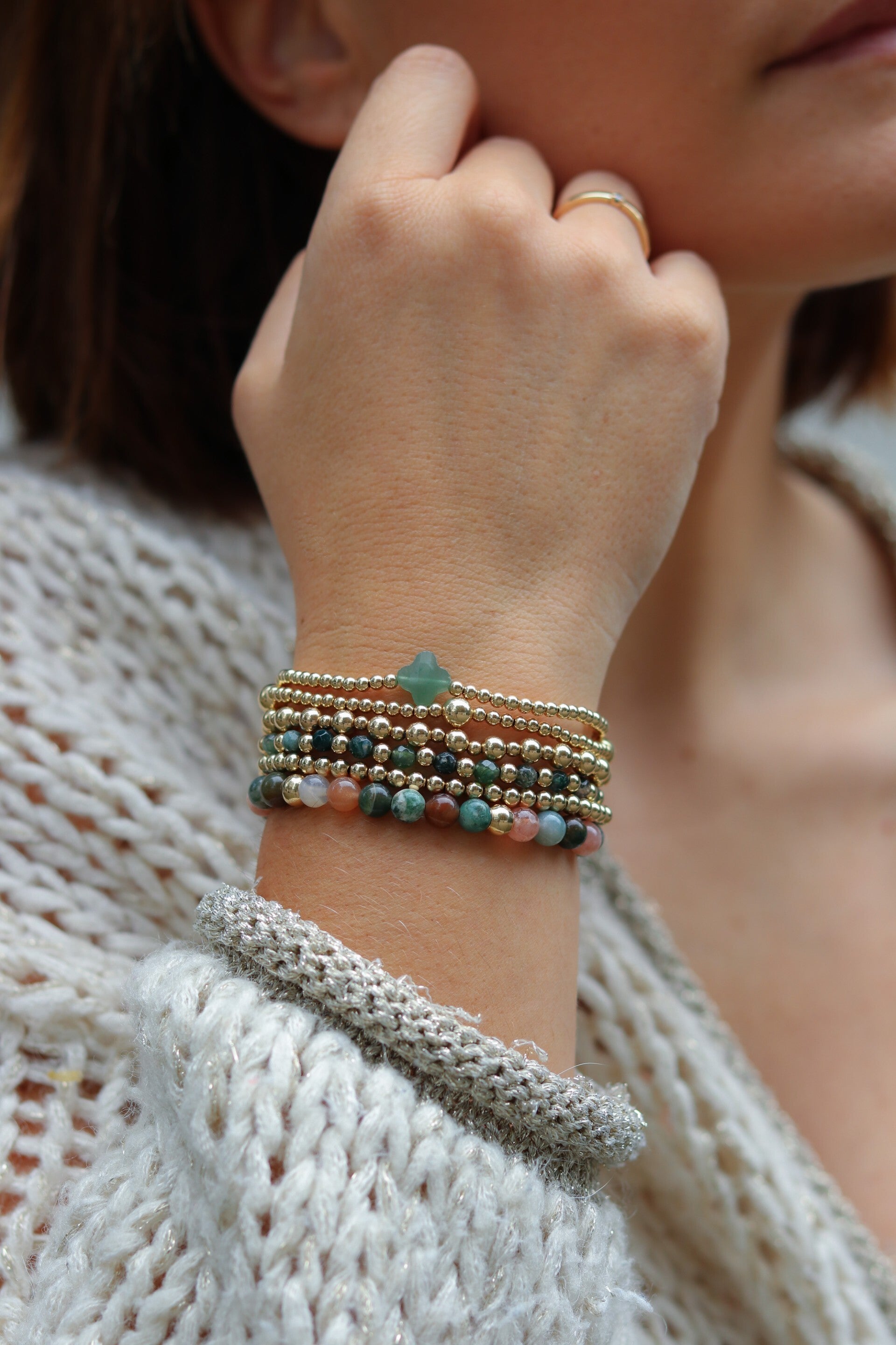 De Aventurine Clover Bracelet bestaat 14 karaat gold filled balletjes van ca 3mm met een prachtige Aventurijn kraal in de vorm van een klavertje. De armband is te dragen als one-piece, maar ook prachtig te combineren met andere armbanden.