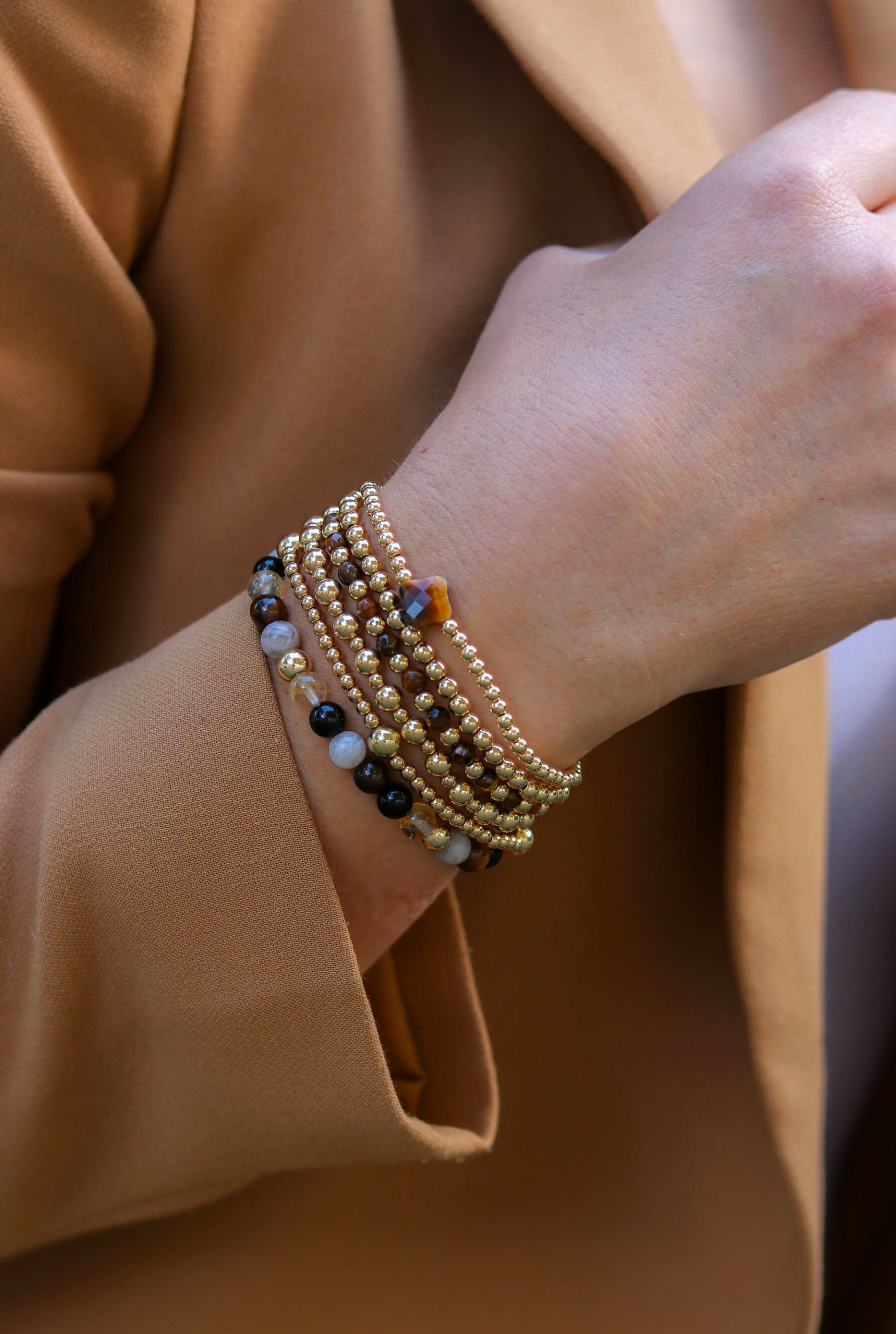 De Tigereye Joy Bracelet bestaat prachtige 4mm Tijgeroog stenen afgewisseld met 3mm gold filled kralen. De armband is te dragen als one-piece, maar ook prachtig te combineren met andere armbanden.