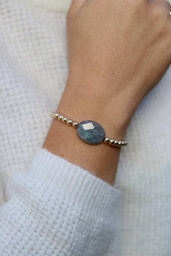 Deze eyecatcher mag niet ontbreken in je sieradendoos. Deze armband gemaakt van 14k gold filled balletjes met een prachtige facetgeslepen Labradoriet steen is te dragen als one-piece, maar is ook mooi te combineren met onze Labradorite Joy Gold Bracelet of één of meerdere van onze essentials armbanden.
