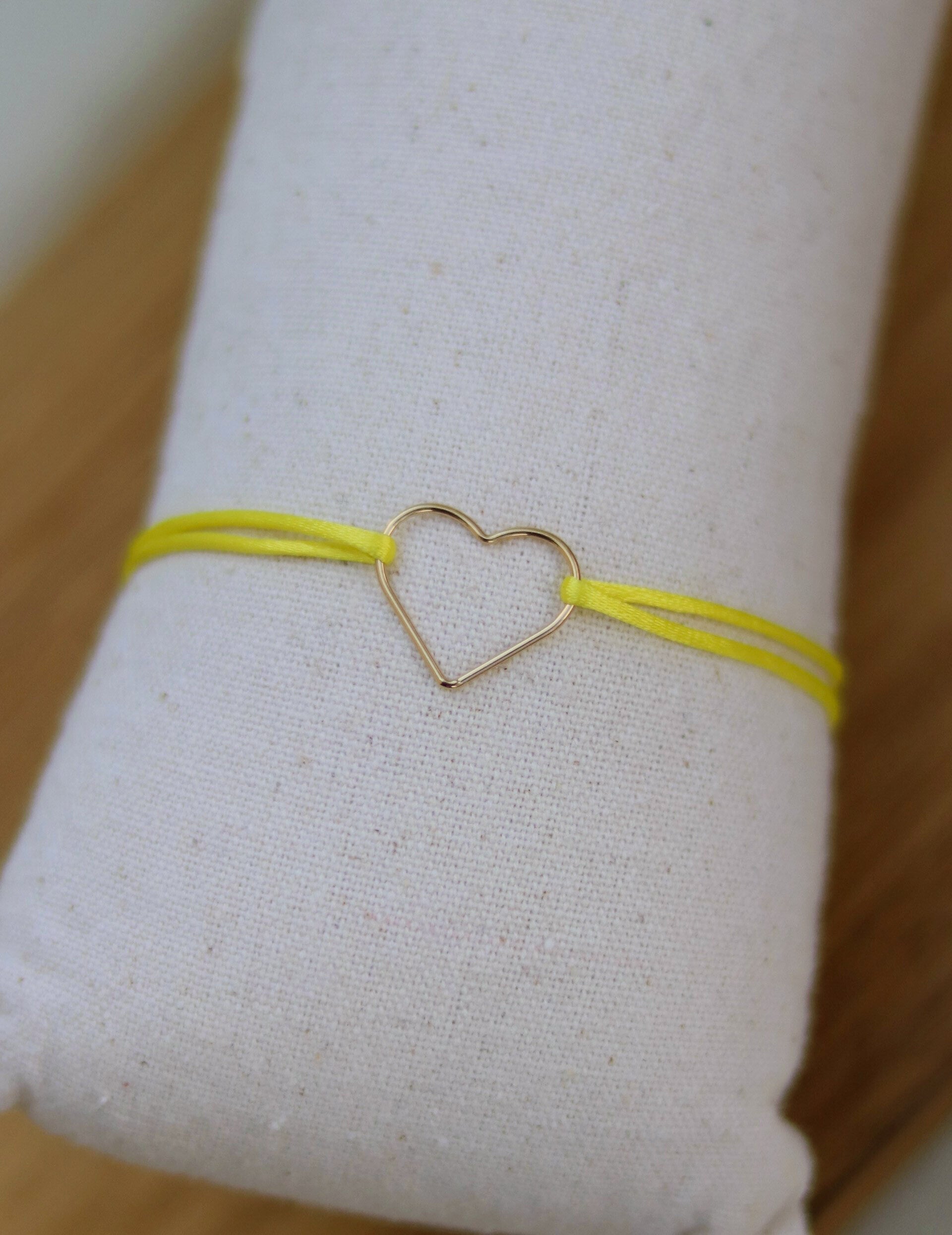 De naam zegt het al: deze prachtige armband bestaat uit een 14-karaats gold-filled hart, waar een felgele satijndraad doorheen is geregen. Het satijndraad is geknoopt en daardoor gemakkelijk zelf op maat te maken.