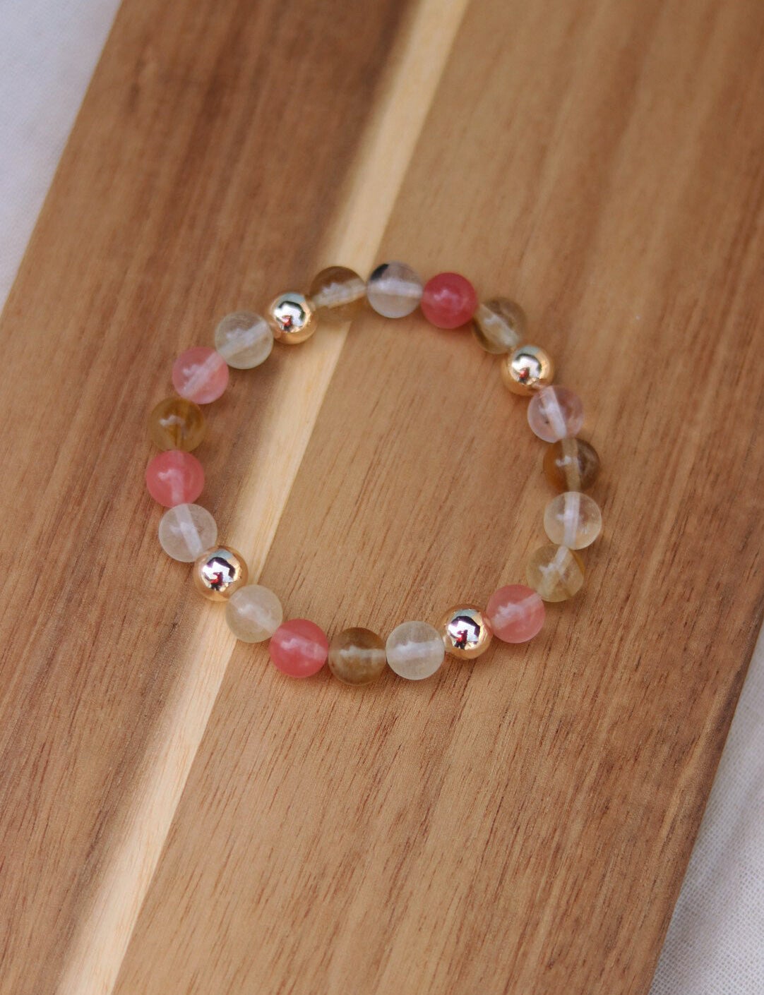 De Blush Gold Bracelet bestaat prachtige meerkleurige Kwarts kralen van 8mm. De armband is van elastiek waardoor het zeer draagbaar is. De lengte van de armband is +/- 17,5 cm. Wenst u een andere maat? Zet bij de bestelling in de opmerking uw maat en wij zorgen ervoor dat u een passende armband ontvangt.